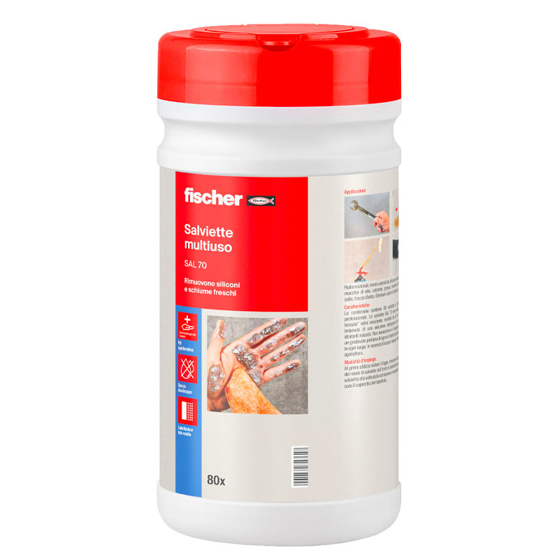 Le salviette multiuso SAL 70 sono salviette lavamani in tessuto-non tessuto imbevute di una soluzione detergente composta da tensioattivi di origine vegetale e un agente antibatterico.